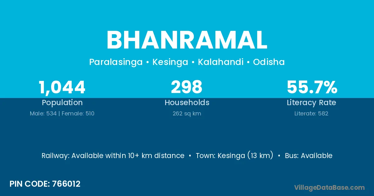 Kesinga (13 km) is the nearest town to Bhanramal village for major economic activities and is located approximately 13 km away.