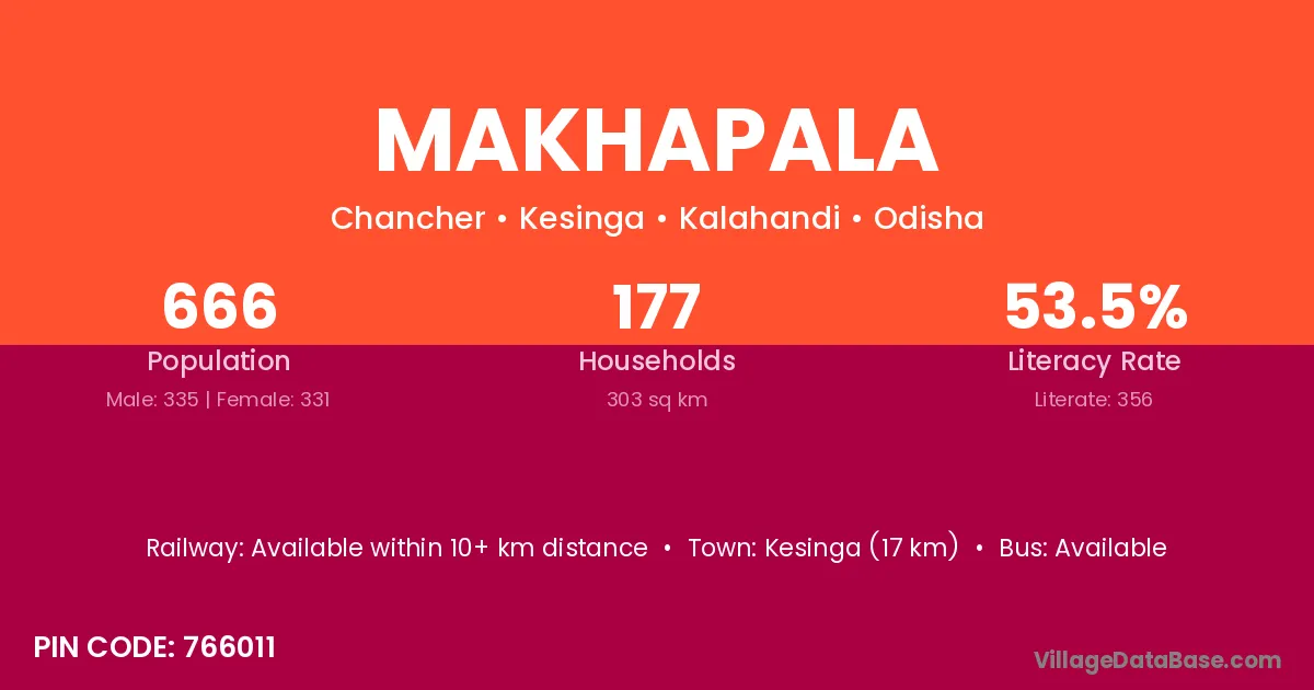 Makhapala village has a total population of 666 people, of which 335 are males and 331 are females.