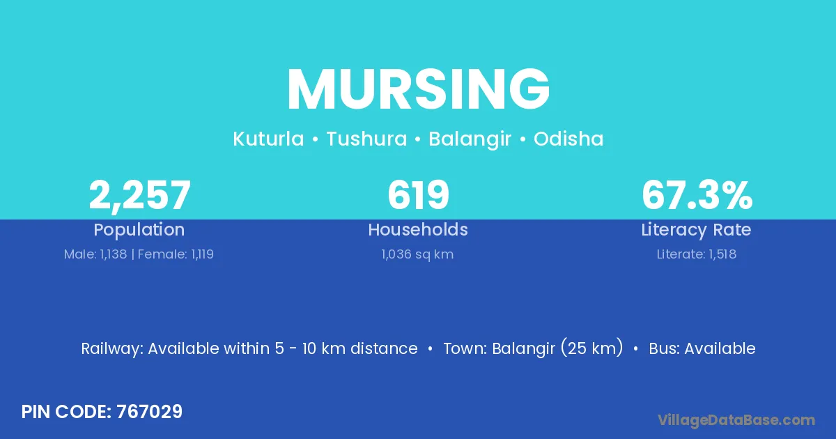 Kesinga (23 km) is the nearest town to Mursing village for major economic activities and is located approximately 23 km away.
