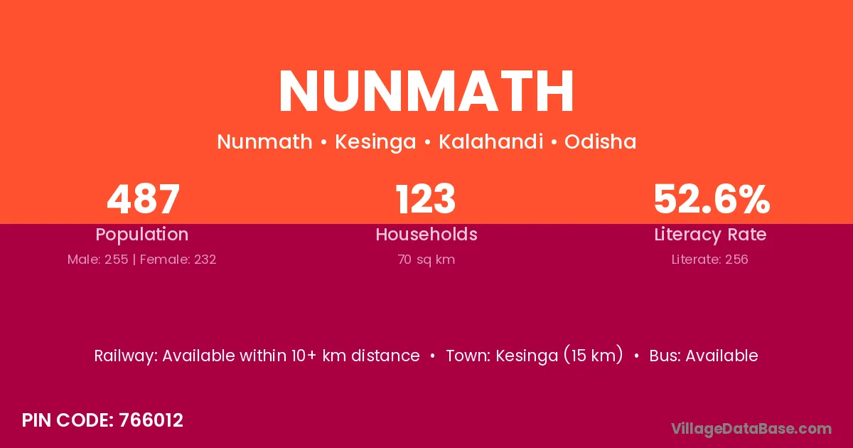 Kesinga (15 km) is the nearest town to Nunmath village for major economic activities and is located approximately 15 km away.
