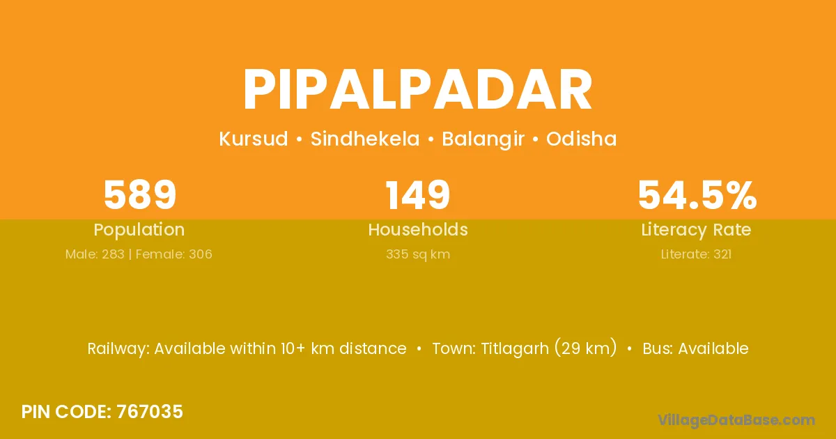 Kesinga (32 km) is the nearest town to Pipalpadar village for major economic activities and is located approximately 32 km away.