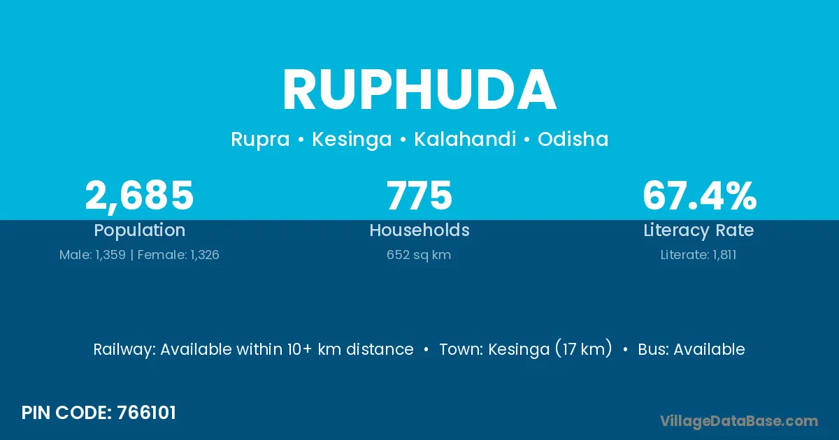 Kesinga (17 km) is the nearest town to Ruphuda village for major economic activities and is located approximately 17 km away.