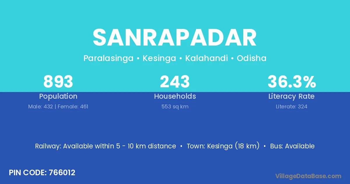 Kesinga (18 km) is the nearest town to Sanrapadar village for major economic activities and is located approximately 18 km away.