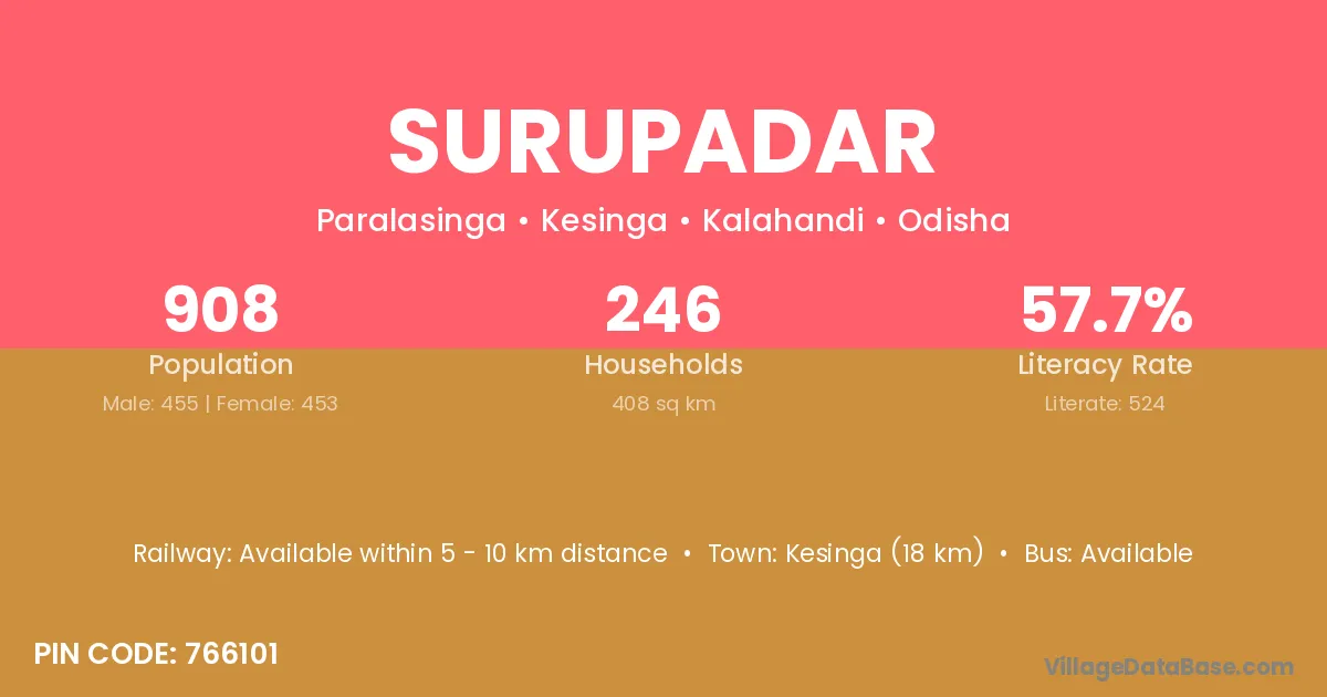 Kesinga (18 km) is the nearest town to Surupadar village for major economic activities and is located approximately 18 km away.