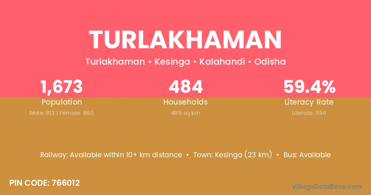 Kesinga (23 km) is the nearest town to Turlakhaman village for major economic activities and is located approximately 23 km away.
