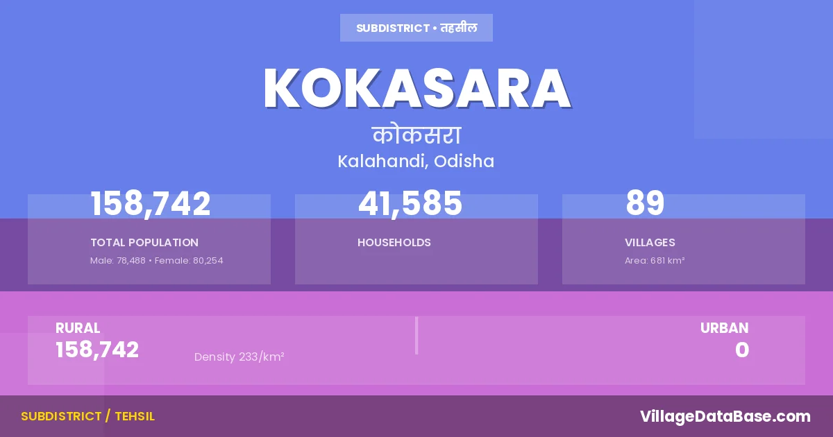 According to the 2011 census The total area of Kokasara Tehsil is 681 km², with a population of 158742 people. The population density is 233 inhabitants per square kilometre, and there are approximately 41585 houses in the sub district.