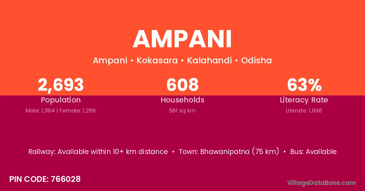 Bhawanipatna (75 km) is the nearest town to Ampani village for major economic activities and is located approximately 75 km away.