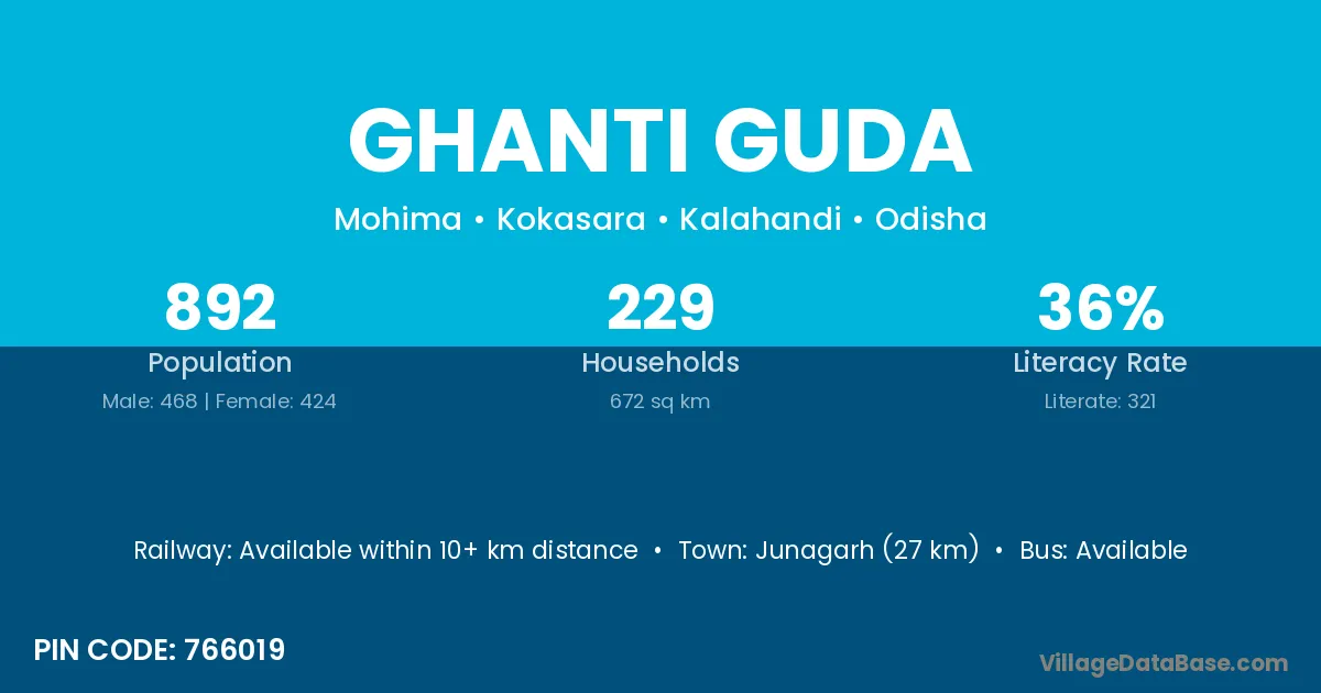 Junagarh (27 km) is the nearest town to Ghanti Guda village for major economic activities and is located approximately 27 km away.