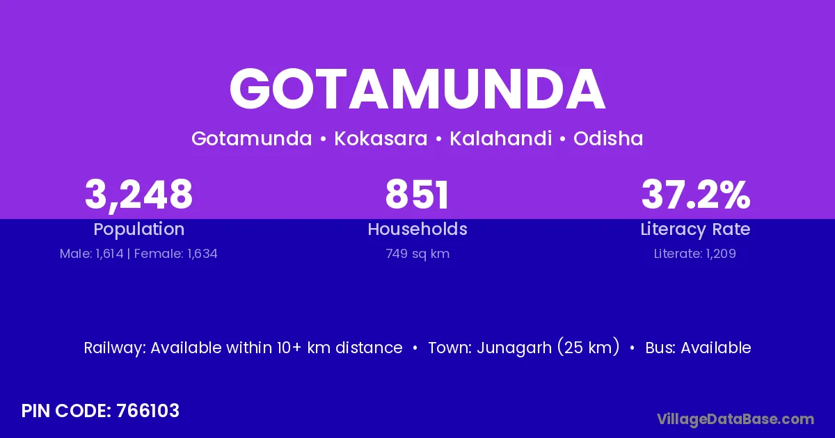 Gotamunda village has a total population of 3,248 people, of which 1,614 are males and 1,634 are females.