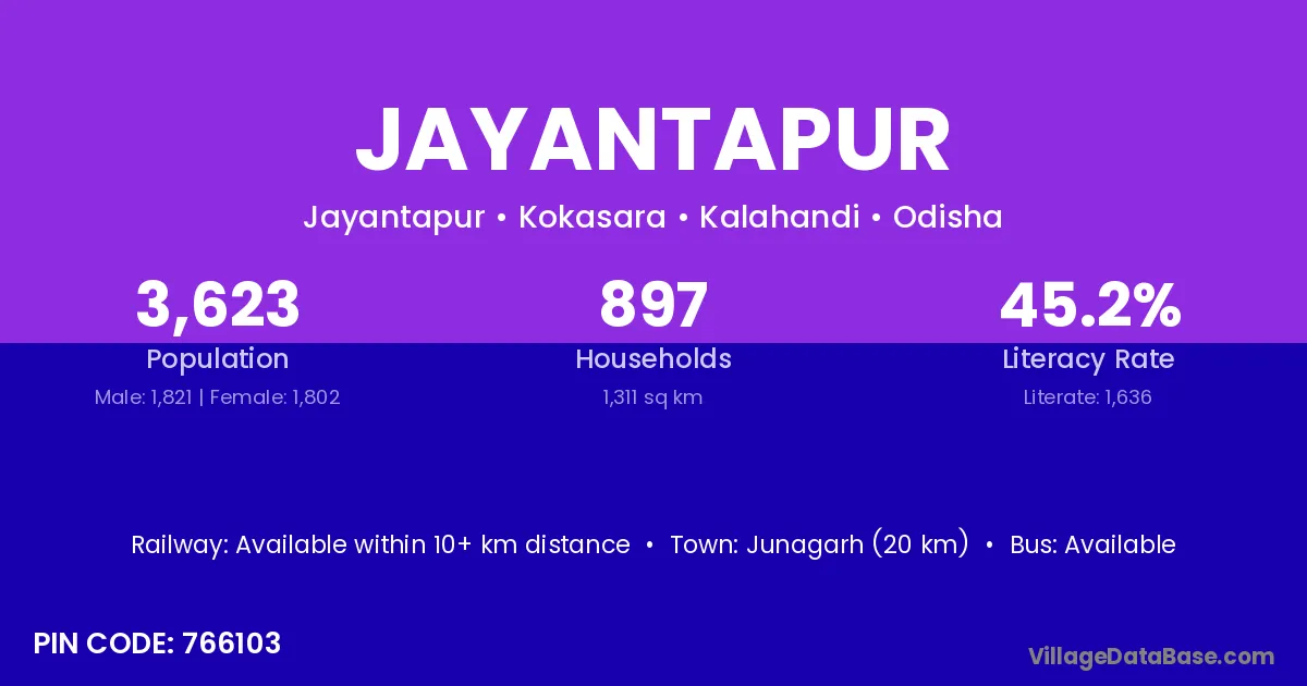 Junagarh (20 km) is the nearest town to Jayantapur village for major economic activities and is located approximately 20 km away.
