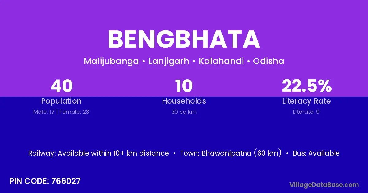 Bhawanipatna (60 km) is the nearest town to Bengbhata village for major economic activities and is located approximately 60 km away.