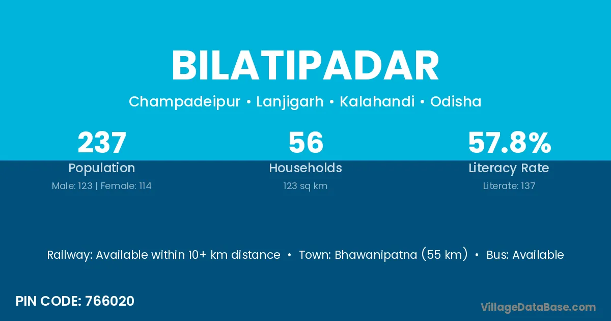 Bhawanipatna (55 km) is the nearest town to Bilatipadar village for major economic activities and is located approximately 55 km away.