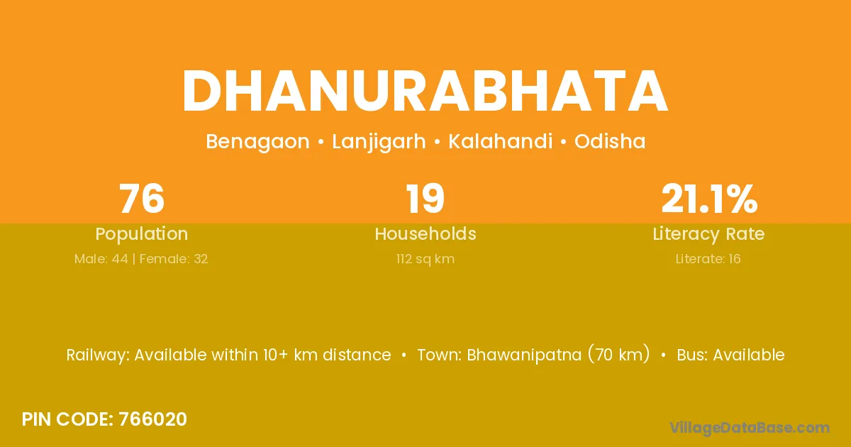 Bhawanipatna (70 km) is the nearest town to Dhanurabhata village for major economic activities and is located approximately 70 km away.