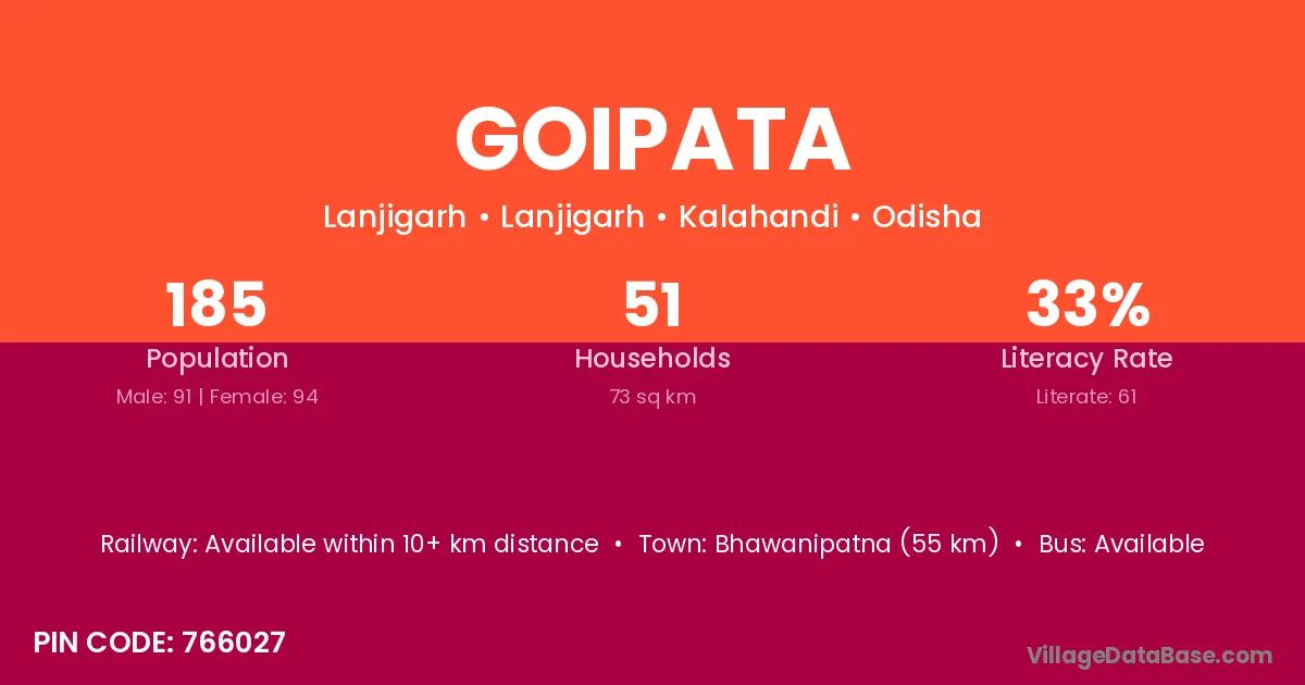 Bhawanipatna (55 km) is the nearest town to Goipata village for major economic activities and is located approximately 55 km away.