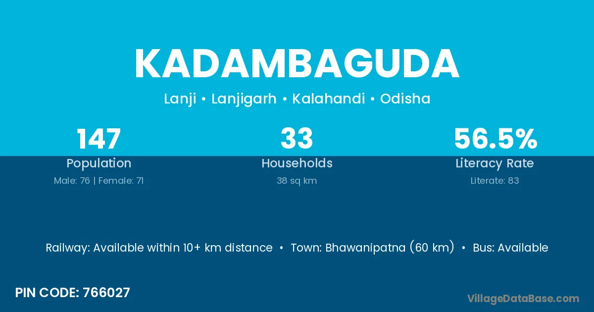 Bhawanipatna (60 km) is the nearest town to Kadambaguda village for major economic activities and is located approximately 60 km away.