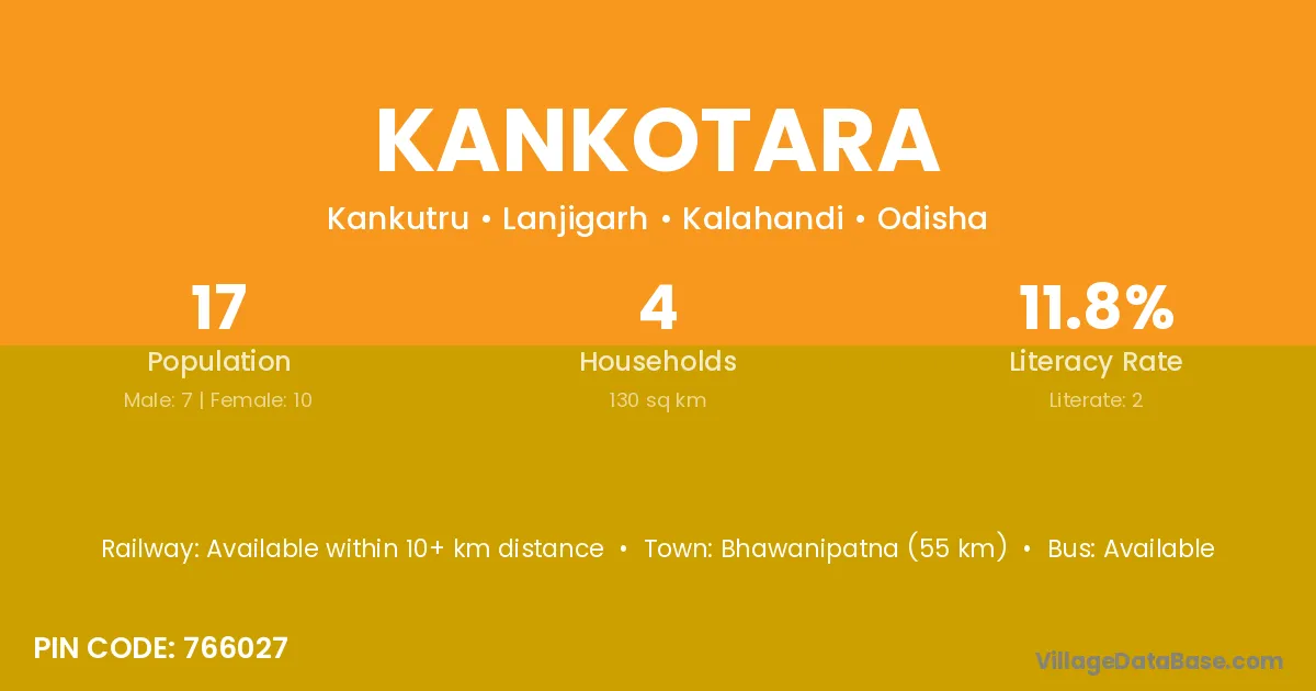 Bhawanipatna (55 km) is the nearest town to Kankotara village for major economic activities and is located approximately 55 km away.