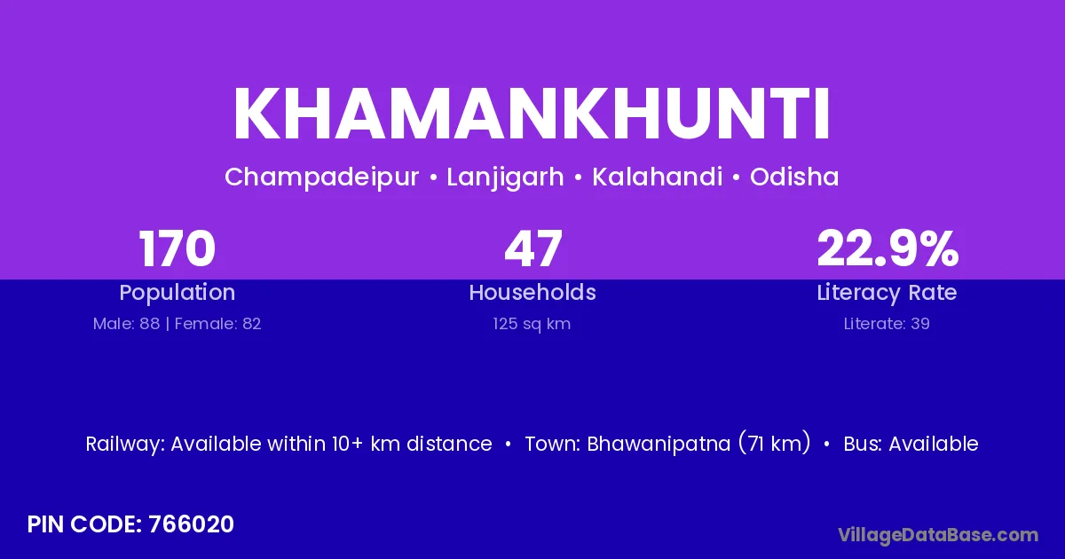 Bhawanipatna (71 km) is the nearest town to Khamankhunti village for major economic activities and is located approximately 71 km away.