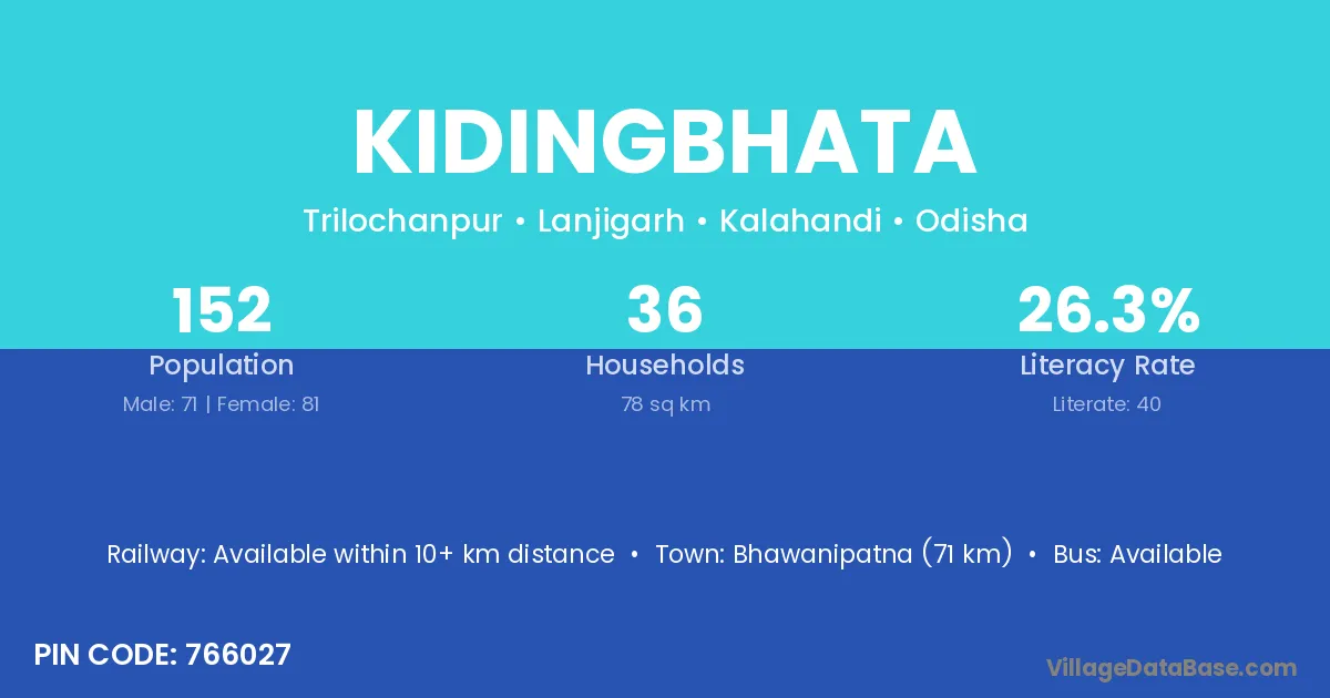 Bhawanipatna (71 km) is the nearest town to Kidingbhata village for major economic activities and is located approximately 71 km away.