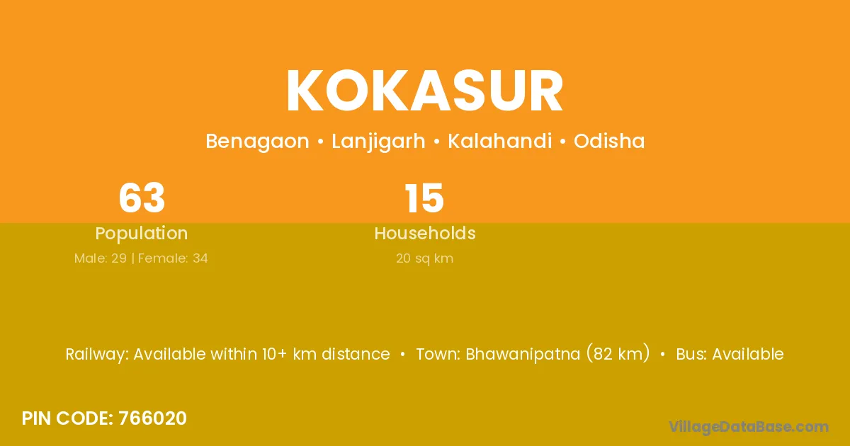 Bhawanipatna (82 km) is the nearest town to Kokasur village for major economic activities and is located approximately 82 km away.
