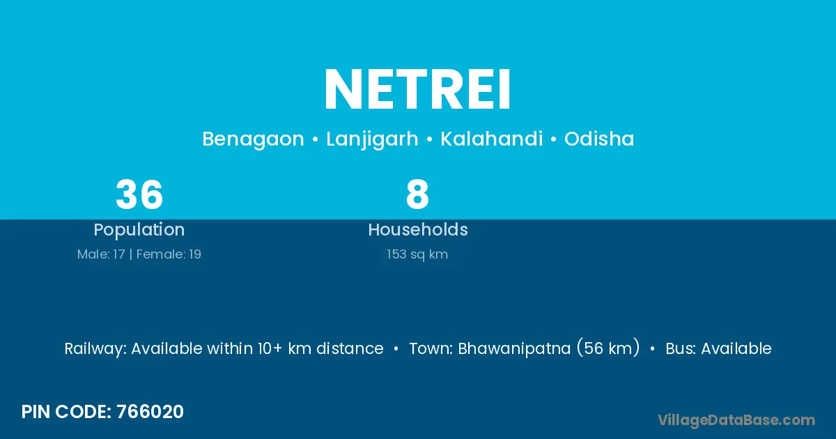 Bhawanipatna (56 km) is the nearest town to Netrei village for major economic activities and is located approximately 56 km away.