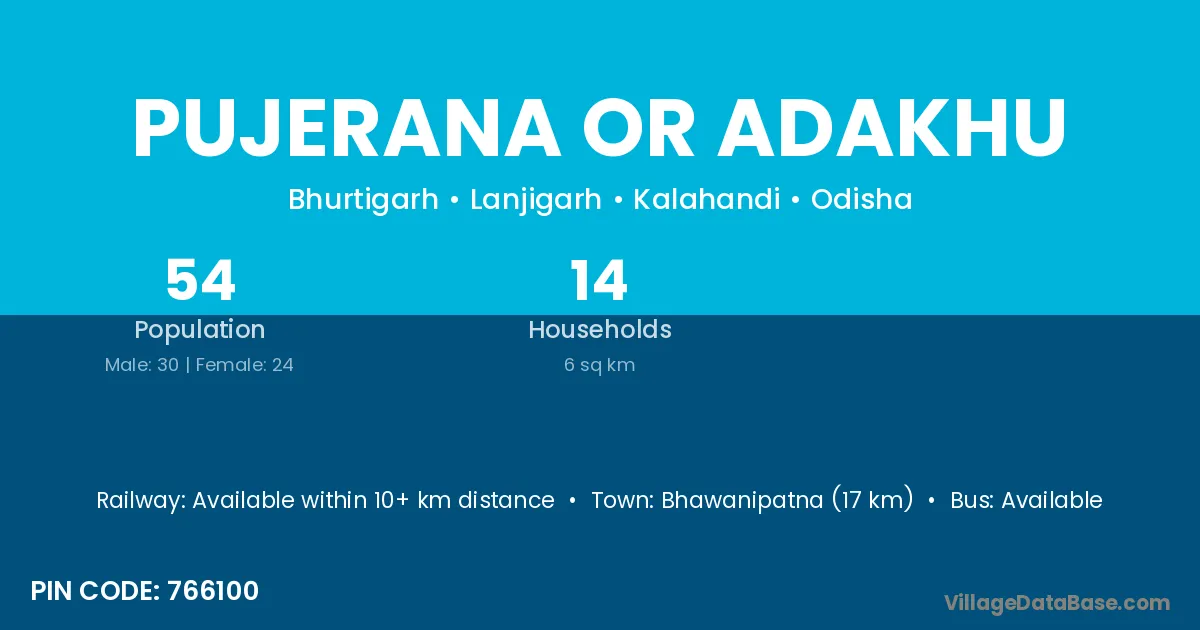 Bhawanipatna (17 km) is the nearest town to Pujerana Or Adakhu village for major economic activities and is located approximately 17 km away.