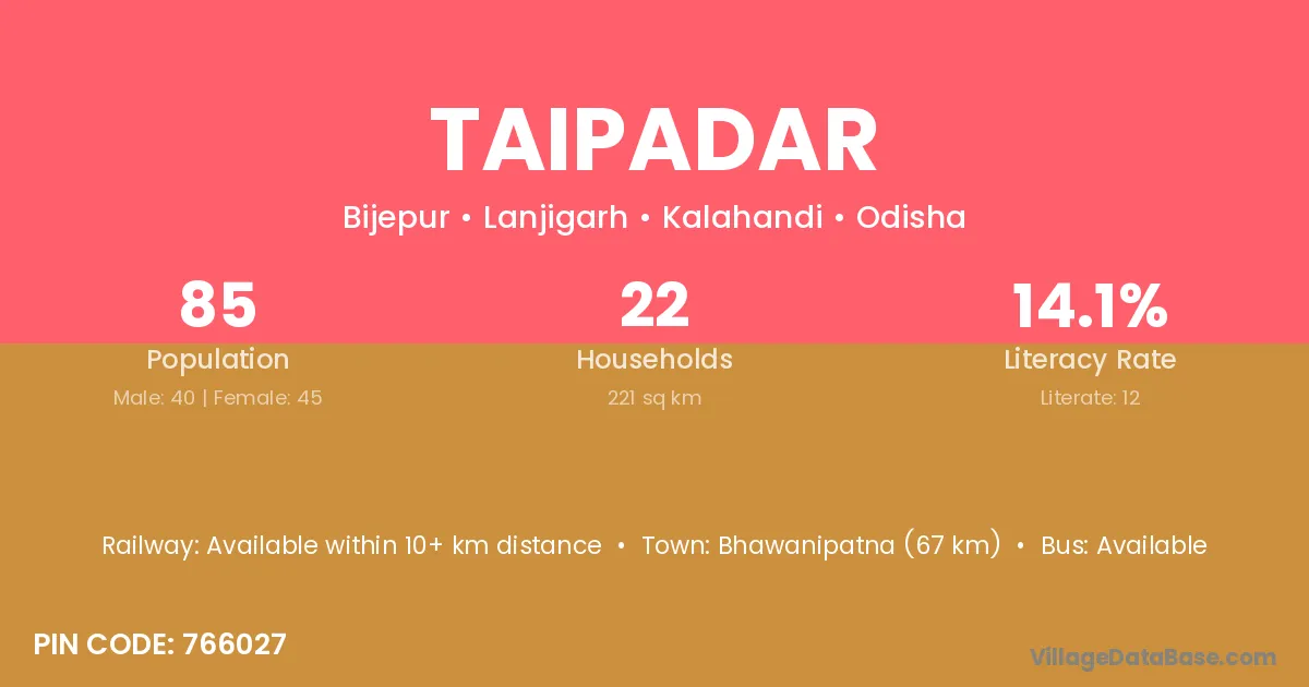 Bhawanipatna (67 km) is the nearest town to Taipadar village for major economic activities and is located approximately 67 km away.