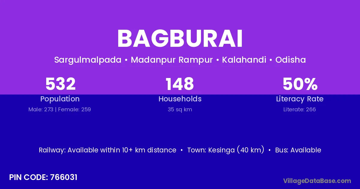 Kesinga (40 km) is the nearest town to Bagburai village for major economic activities and is located approximately 40 km away.