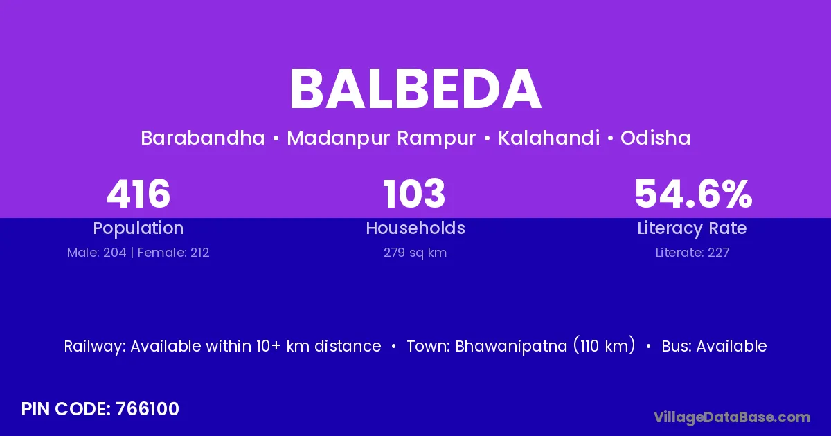 Bhawanipatna (110 km) is the nearest town to Balbeda village for major economic activities and is located approximately 110 km away.