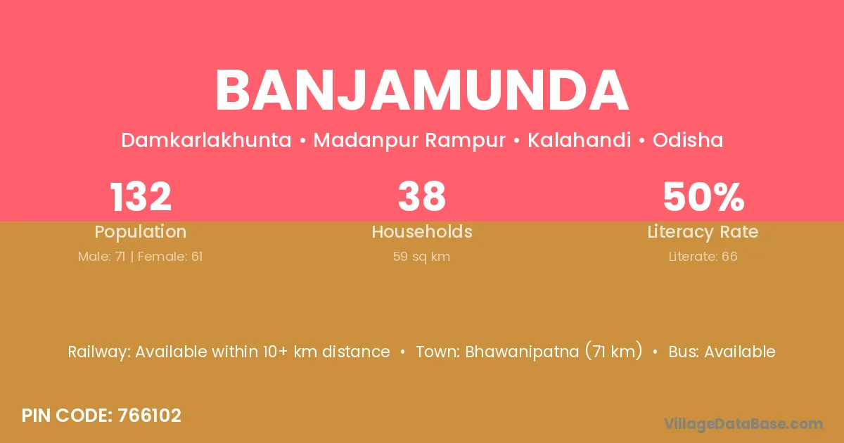 Bhawanipatna (71 km) is the nearest town to Banjamunda village for major economic activities and is located approximately 71 km away.
