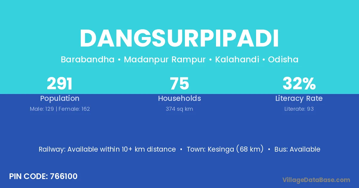 Kesinga (68 km) is the nearest town to Dangsurpipadi village for major economic activities and is located approximately 68 km away.