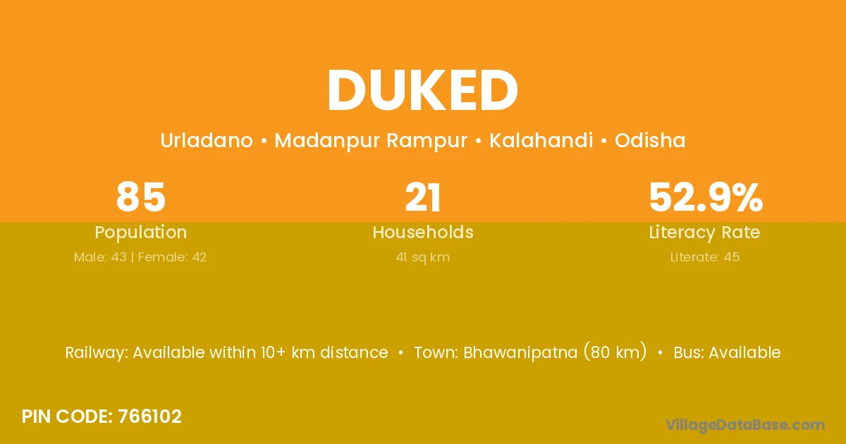 Bhawanipatna (80 km) is the nearest town to Duked village for major economic activities and is located approximately 80 km away.