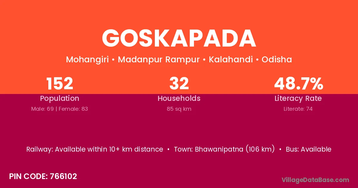 Bhawanipatna (106 km) is the nearest town to Goskapada village for major economic activities and is located approximately 106 km away.