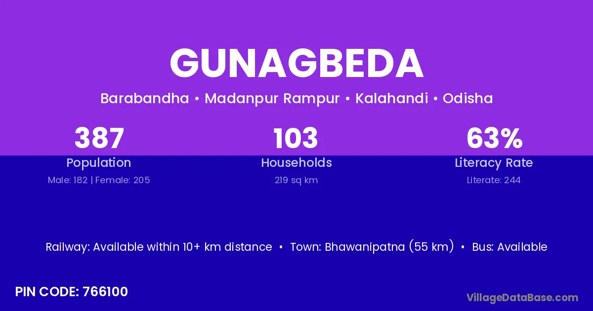 Bhawanipatna (55 km) is the nearest town to Gunagbeda village for major economic activities and is located approximately 55 km away.
