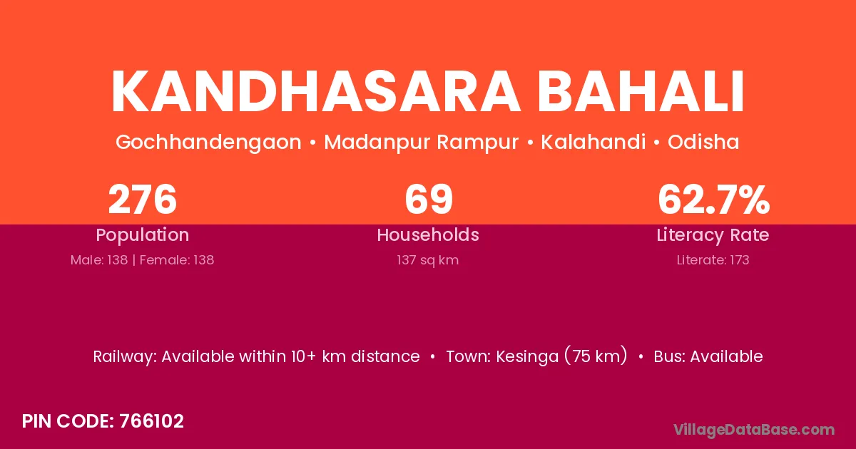 Kesinga (75 km) is the nearest town to Kandhasara Bahali village for major economic activities and is located approximately 75 km away.