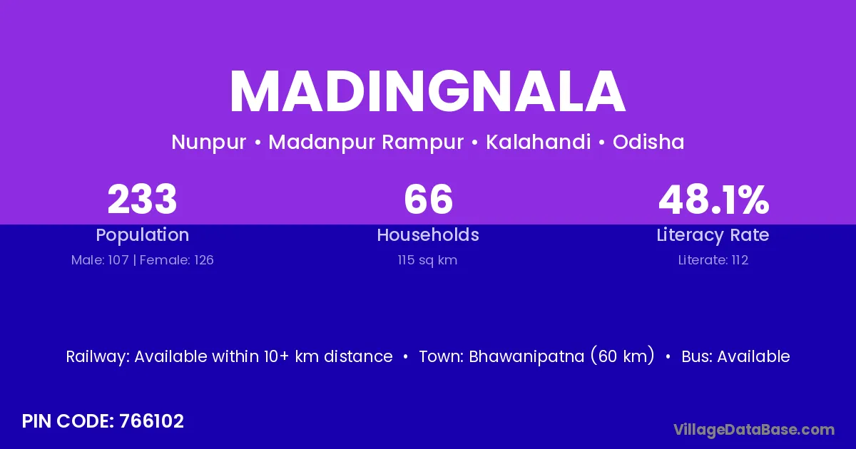 Bhawanipatna (60 km) is the nearest town to Madingnala village for major economic activities and is located approximately 60 km away.