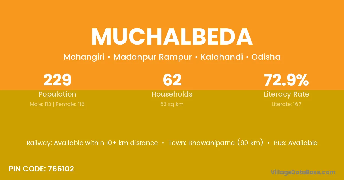 Bhawanipatna (90 km) is the nearest town to Muchalbeda village for major economic activities and is located approximately 90 km away.