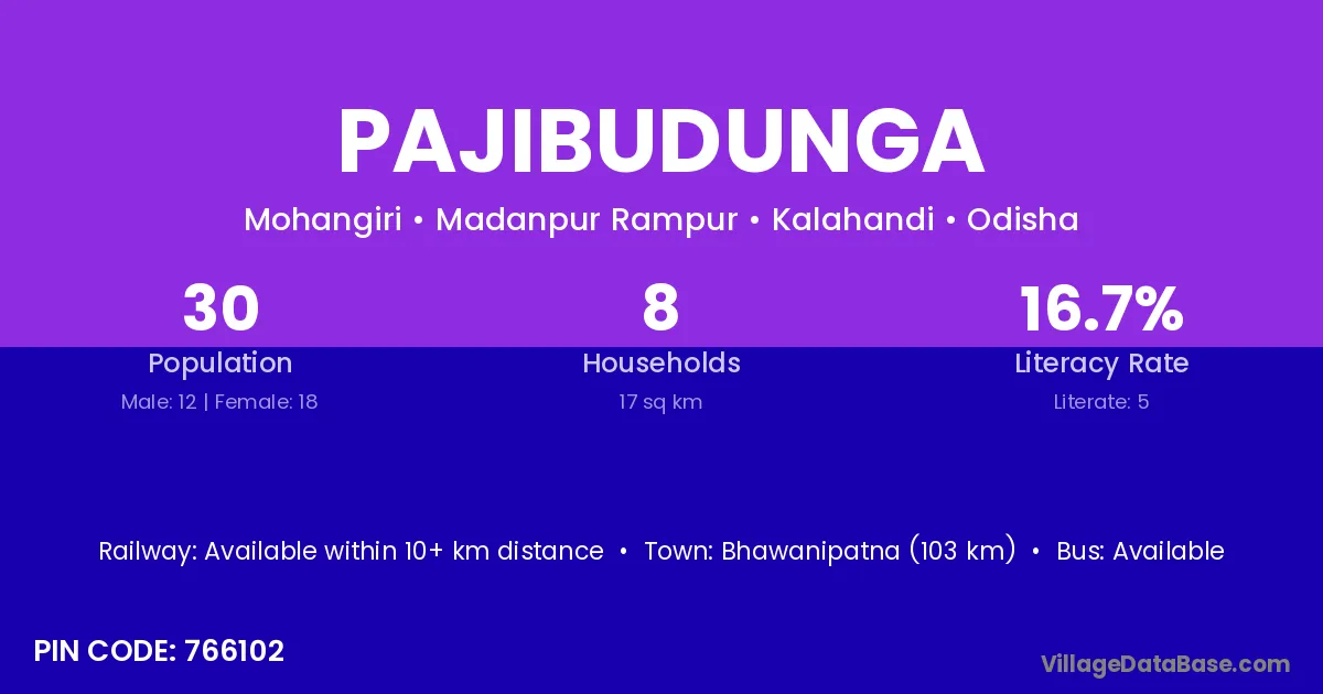 Bhawanipatna (103 km) is the nearest town to Pajibudunga village for major economic activities and is located approximately 103 km away.