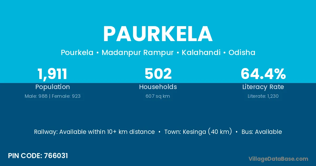 Kesinga (40 km) is the nearest town to Paurkela village for major economic activities and is located approximately 40 km away.