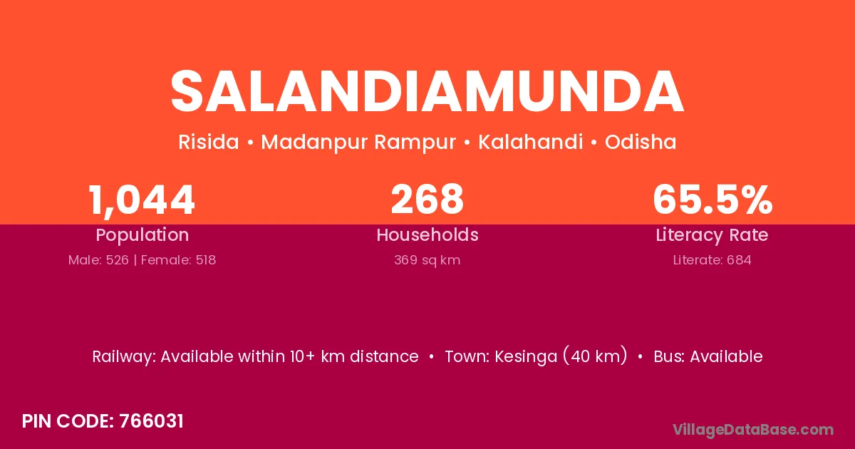 Kesinga (40 km) is the nearest town to Salandiamunda village for major economic activities and is located approximately 40 km away.