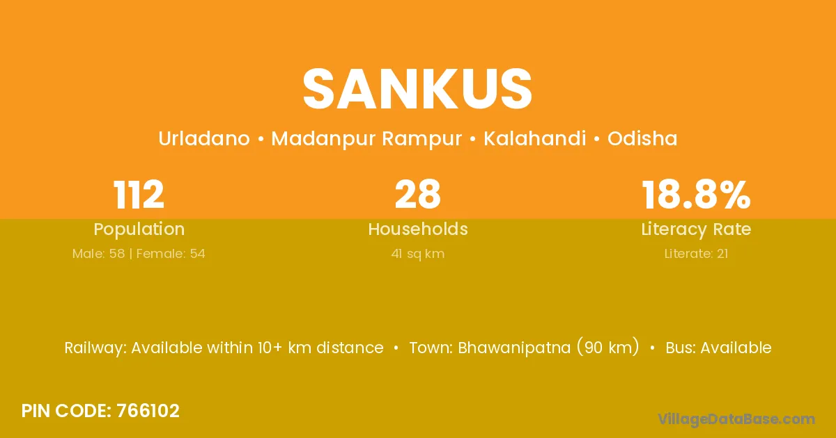 Bhawanipatna (90 km) is the nearest town to Sankus village for major economic activities and is located approximately 90 km away.