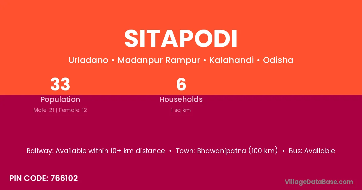 Bhawanipatna (100 km) is the nearest town to Sitapodi village for major economic activities and is located approximately 100 km away.