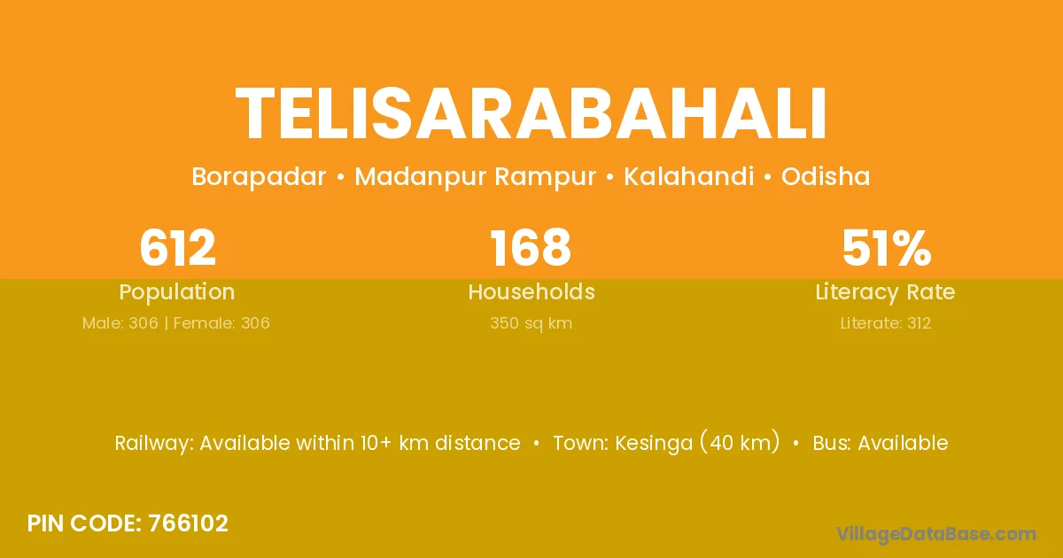 Kesinga (40 km) is the nearest town to Telisarabahali village for major economic activities and is located approximately 40 km away.