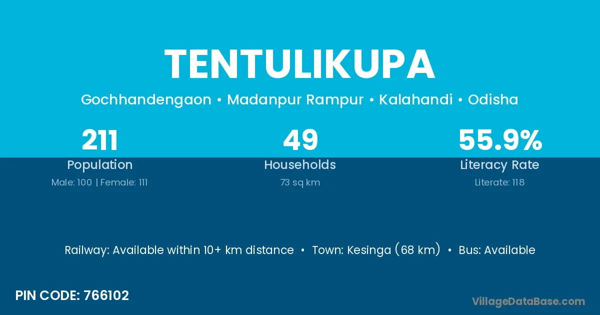 Kesinga (68 km) is the nearest town to Tentulikupa village for major economic activities and is located approximately 68 km away.