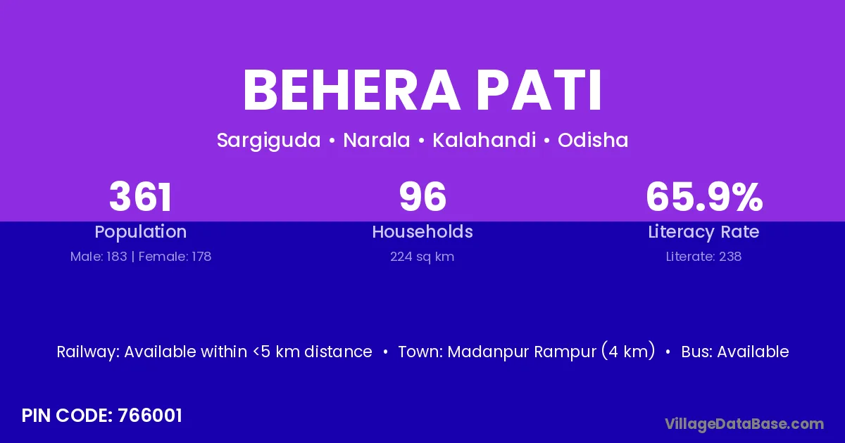 Madanpur Rampur (4 km) is the nearest town to Behera Pati village for major economic activities and is located approximately 4 km away.