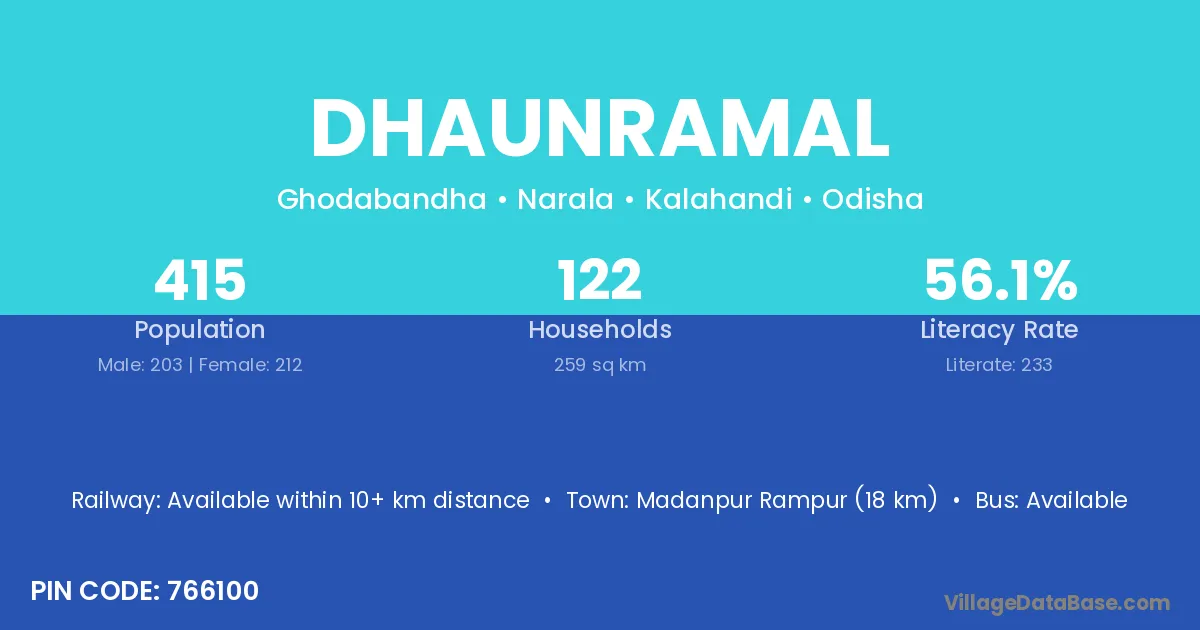 Dhaunramal village has a total population of 415 people, of which 203 are males and 212 are females.