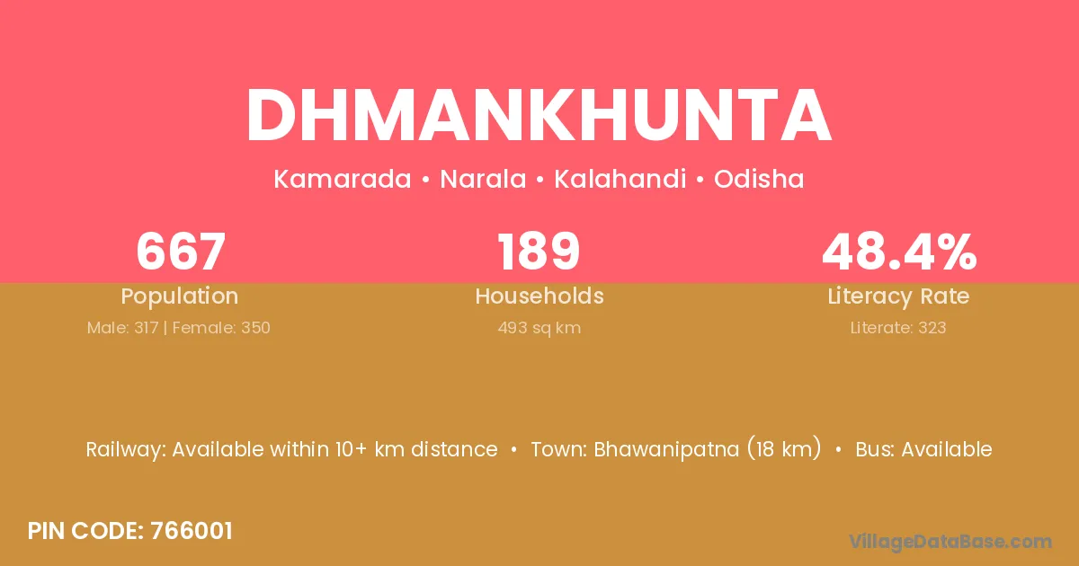 Bhawanipatna (18 km) is the nearest town to Dhmankhunta village for major economic activities and is located approximately 18 km away.