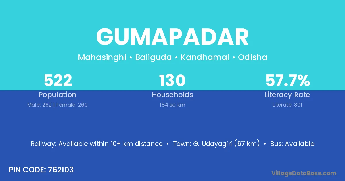 Bhawanipatna (20 km) is the nearest town to Gumapadar village for major economic activities and is located approximately 20 km away.