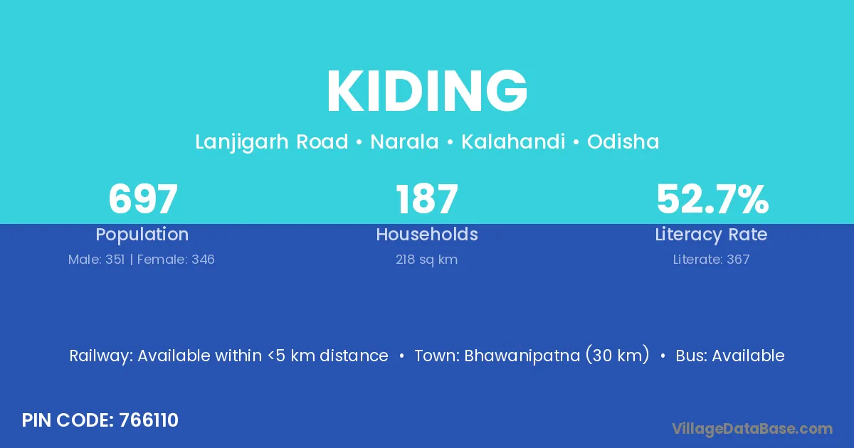 Bhawanipatna (30 km) is the nearest town to Kiding village for major economic activities and is located approximately 30 km away.
