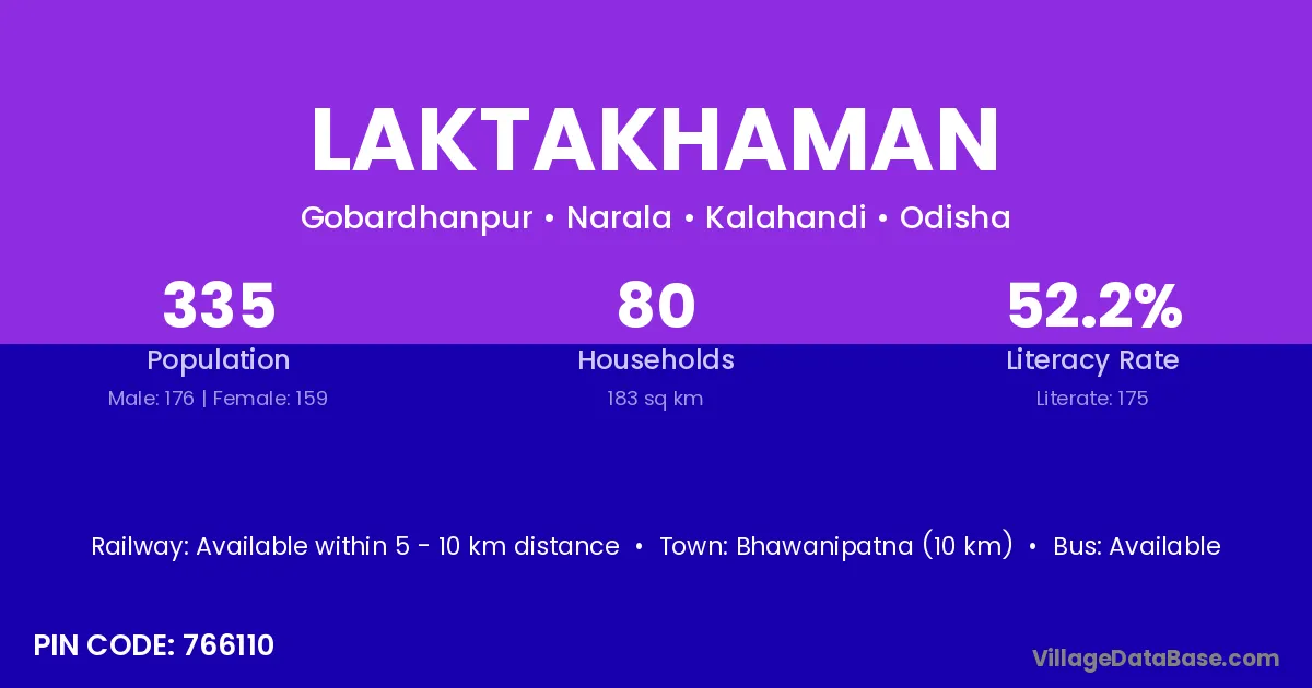 Bhawanipatna (10 km) is the nearest town to Laktakhaman village for major economic activities and is located approximately 10 km away.