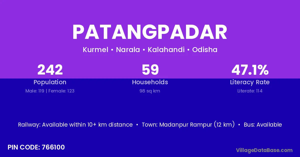Madanpur Rampur (12 km) is the nearest town to Patangpadar village for major economic activities and is located approximately 12 km away.